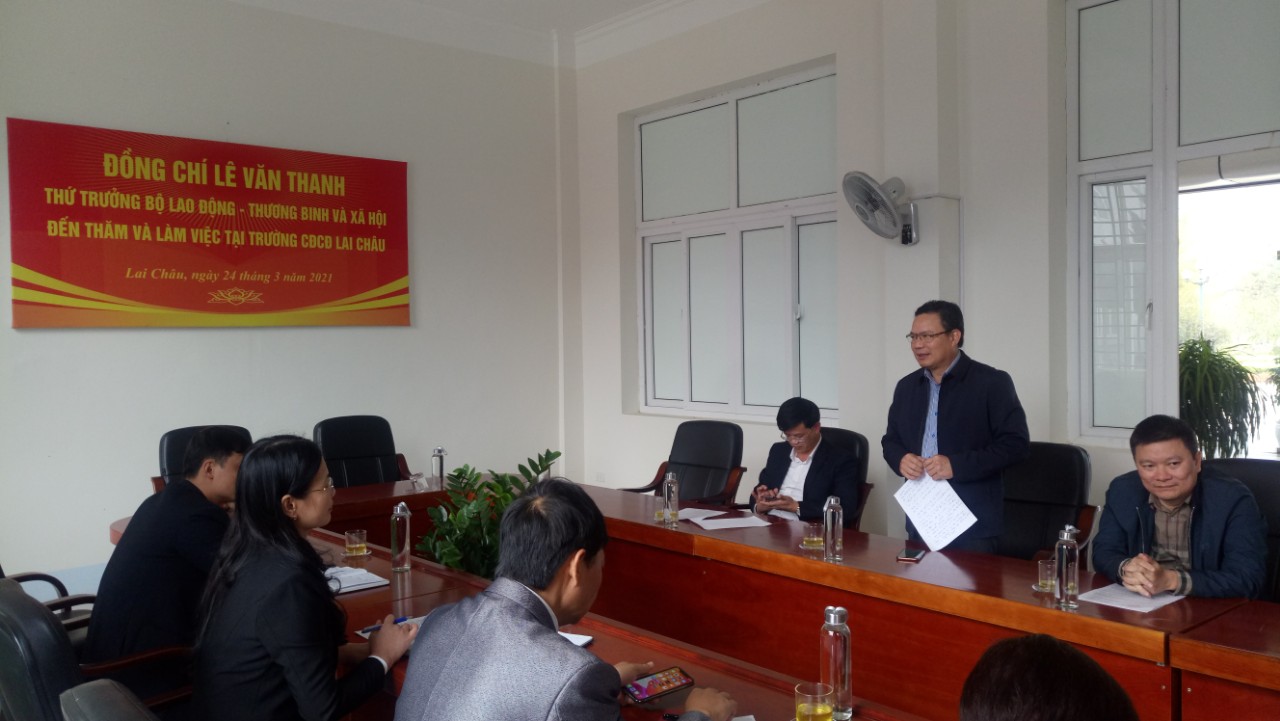 Đồng chí Thứ trưởng ghi nhận những cố gắng, nỗ lực của tập thể BGH, đội ngũ cán bộ, giáo viên Nhà trường sau sát nhập, giải đáp các vướng mắc của nhà trường, chỉ đạo các bộ phận tiếp nhận các kiến nghị của nhà trường để nghiên cứu, giúp đỡ. Đồng chí đề nghị tập thể BGH, lãnh đạo các bộ phận Nhà trường tiếp tục đoàn kết, nỗ lực vì mục tiêu chung phát triển nhà trường, nâng cao chất lượng đạo tạo đáp ứng yêu cầu xã hội. Đề nghị Nhà trường tiếp tục tham mưu bổ sung, nâng cấp mua sắm cơ sở vật chất, trang thiết bị dạy học; đạo tạo đội ngũ đáp ứng ngành nghề xã hội cần; xây dựng ngành nghề, chương trình đào tạo phục vụ nhu cầu nhân lực của tỉnh và cả nước.