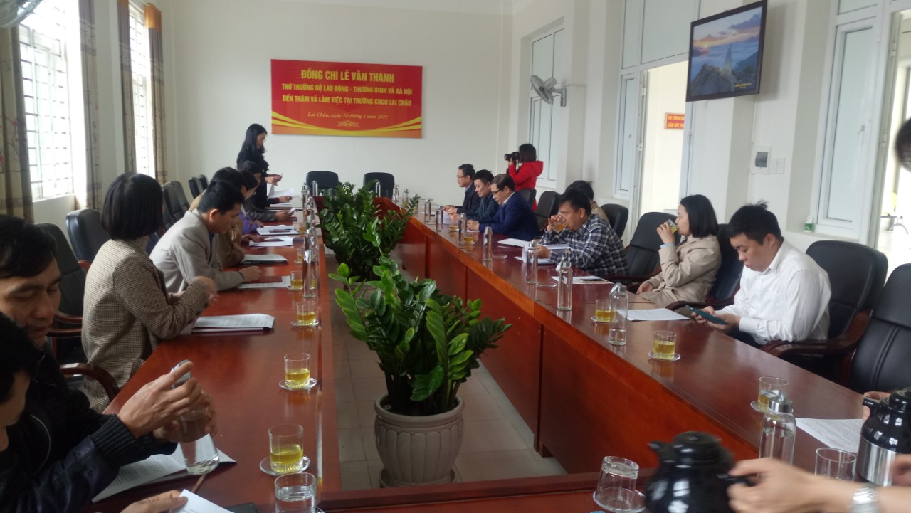 Dự buổi làm việc về phía đoàn công tác, có đồng chí Thứ trưởng cùng các đồng chí lãnh đạo các cục, tổng cục, phía tỉnh có đồng chí Giám đốc Sở Lao động Thương binh và xã hội, lãnh đạo các phòng ban của Sở; phía nhà trường có các đồng chí trong Ban Giám hiệu, lãnh đạo các phòng khoa Nhà trường.
