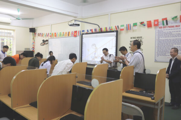 Kết thúc chương trình làm việc, phía đoàn Nhật Bản di chuyển tham quan các lớp học tiếng Nhật và khu thực hành đào tạo dán giấy, decan tại trường Cao đẳng Cộng đồng Hà Nội.
