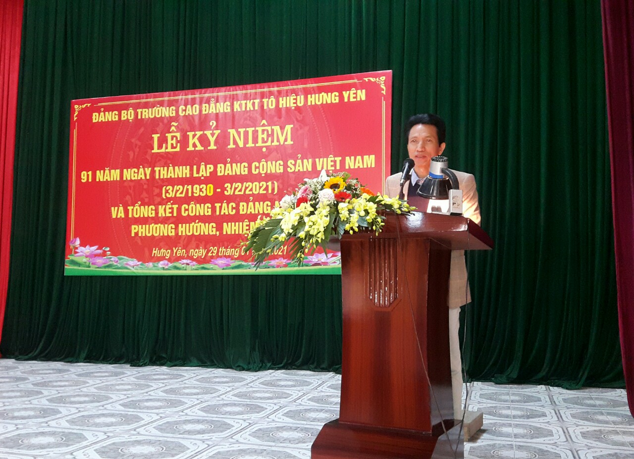 Mở đầu buổi lễ, đồng chí Trần Thanh Liêm – Bí thư Đảng ủy – Hiệu trưởng nhà trường đã lên ôn lại truyền thống 91 năm ngày thành lập Đảng và khảng định những thắng lợi vẻ vang của cách mạng và đất nước trong suốt 91 năm qua là nhờ đường lối lãnh đạo đúng đắn của Đảng trên cơ sở vận dụng sáng tạo Chủ nghĩa Mác – Lê Nin và tư tưởng Hồ Chí Minh.Trong 60 năm qua, Đảng bộ Trường Cao đẳng Kinh tế – Kỹ thuật Tô Hiệu Hưng Yên luôn kiên định trung thành đi theo con đường mà Đảng và Bác Hồ lựa chọn, vận dụng hiệu quả đường lối, chính sách của Đảng vào hoàn cảnh thực tiễn của tỉnh và nhà trường, vượt qua khó khăn, vươn lên giành nhiều thắng lợi trong sự nghiệp xây dựng, phát triển nhà trường, đóng góp vào sự thắng lợi của tỉnh nhà nói riêng và đất nước nói chung.